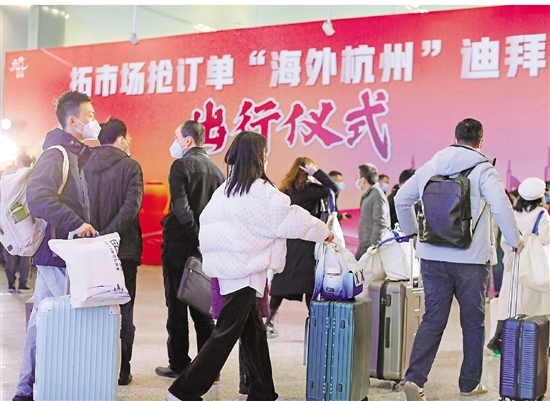 12月15日,拓市场抢订单“海外杭州”迪拜站出行仪式在杭州萧山国际机场举行,杭州企业代表带上参展物品出发迪拜。