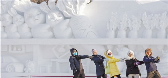 12月31日,许多市民和游客来到第35届哈尔滨太阳岛国际雪雕艺术博览会园区游玩,欢度元旦假期。