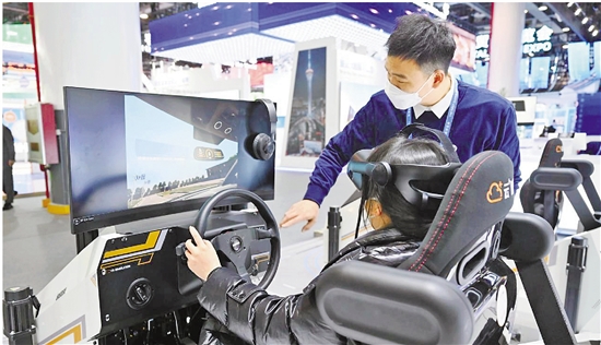 2022年12月在杭州开幕的首届全球数字贸易博览会上,参观者在体验虚拟驾驶系统。