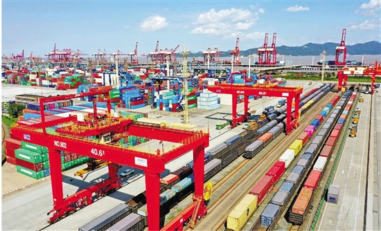 宁波舟山港铁路北仑港站海铁联运作业场景。
