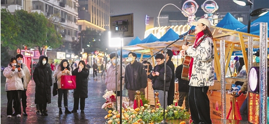 1月2日晚,在杭州武林夜市,曾经熟悉的烟火气又回来了。元旦假期,武林路举行开年鸿运活动,布置新年主题馆、时光音乐会、武林红兔集等。图为驻唱歌手唱民谣、与观众互动。 本报记者 董旭明 摄