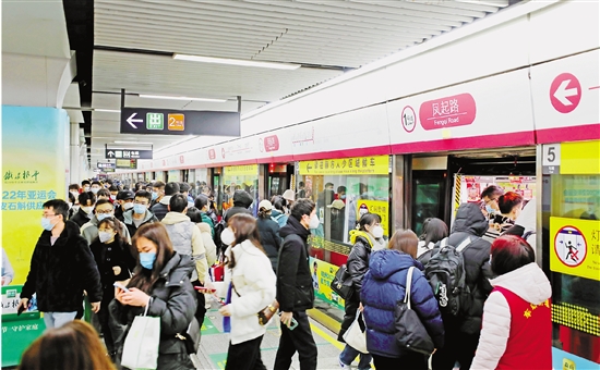 连日来,杭州地铁客流明显回暖,车厢上座率显著增加。图为人来人往的杭州地铁凤起路站。