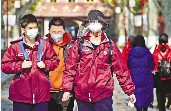1月6日,2023年浙江省学考选考首考开考。上午的考试结束后,杭州高级中学贡院校区的考生在明媚的阳光下走出考点。 本报记者 潘海松 摄