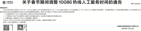 关于春节期间调整10086热线人工服务时间的通告