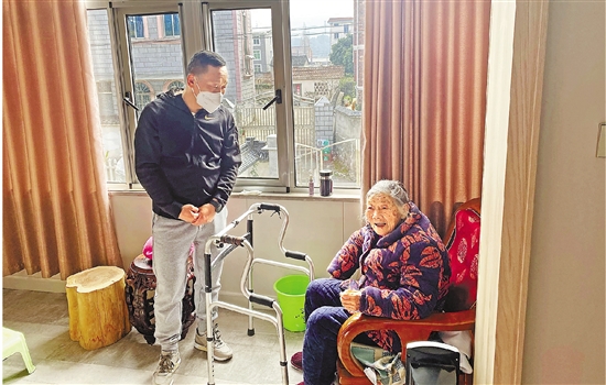 富阳区富春街道宵井村村党委书记赖新明(左)走访村里的老人。 本报记者 王晨辉 摄