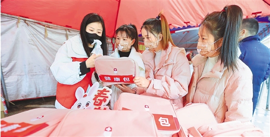1月14日,在安吉县递铺街道职工之家——净土社区文化礼堂新家苑,街道工会、妇联、团委等联合举行“安心留安·温暖递铺”活动,为外地留安的员工及其家属提供送春联、福字、健康礼包等温情活动,让外地员工留在安吉安心过年。 共享联盟·安吉 夏鹏飞 摄 |