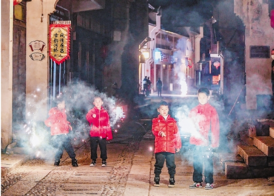 春节期间,在杭州市临安区河桥镇,孩子们在河桥老街欢快地玩烟花。