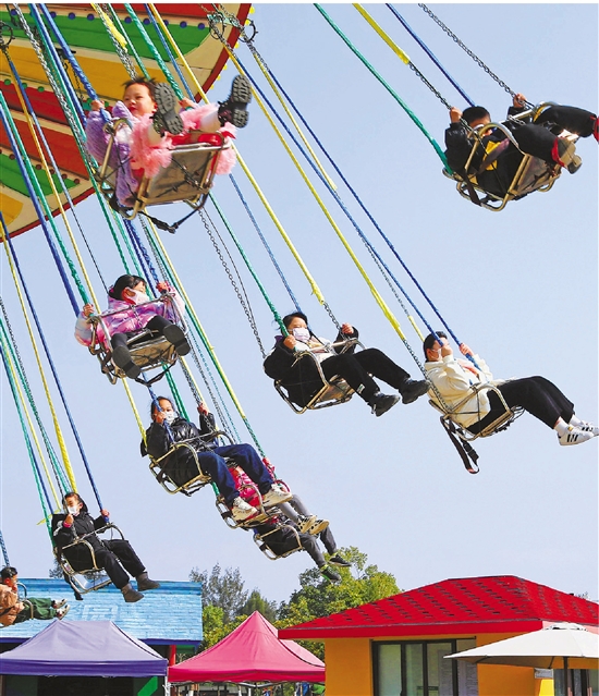 1月25日,小朋友在玉环市漩门湾观光农业园玩旋转秋千,乡村农旅区成了亲子乐园。 拍友 吴达夫 摄