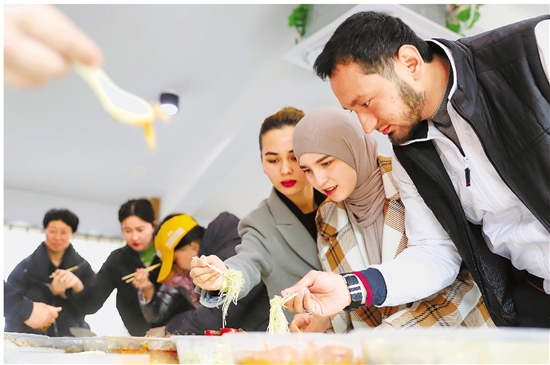 日前,台州学院联合路桥区侨联组织外国学生走访路桥城乡,通过非遗制作、品尝美食等,让他们感知中国文化、乡村之美。图为外国学生品尝当地特色美食食饼筒。 拍友 蒋友青 摄