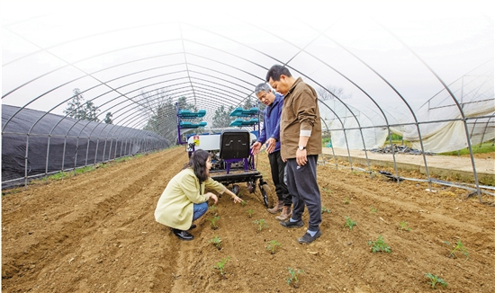 记者(左)与省农业机械研究院的工作人员、天宏七彩田园家庭农场负责人章红亮一起检验移栽效果。 拍友 杨梅清 摄