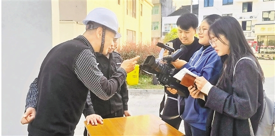 本报记者(右一)加入韩埠村“温州一村人”拍摄剧组,和当地村民一起拍摄短视频《如此采访》。 拍友 陈姝彤 摄