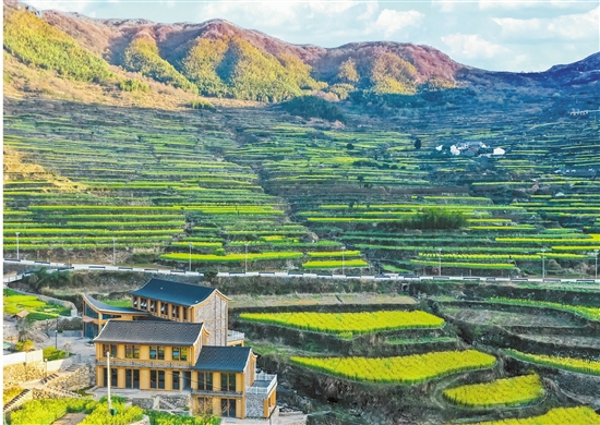 3月,覆卮山千年梯田进入油菜花季,一旁黄色小楼即将成为“半山伴山”乡村文旅综合体,帮助当地进一步打响乡村旅游品牌。