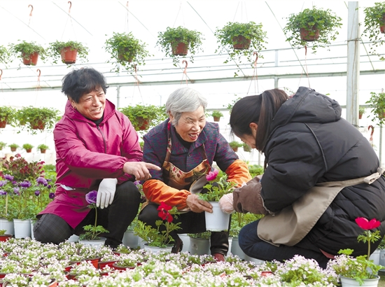 长安镇天明村农民在“共富工坊”养护鲜花 张会 摄