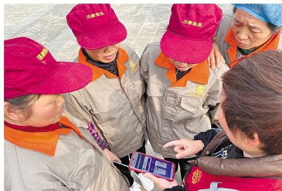 龙岗镇汤家湾村网格员胡桃英指导园区职工下载“国家反诈中心”APP 刘海权 摄
