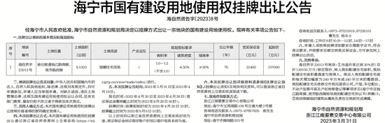 海自然字23013号地块:①当溢价率达到30%时(总价139100万元)锁定限价,转入竞拍配建住宅面积,竞拍配建住宅面积最高者为竞得人。竞买人竞拍配建住宅面积每次增加幅度为240平方米或240平方米的整数倍。竞拍配建住宅无偿移交市相关国资公司,户型、车位配比、不动产发票开具及产权转移登记等事项详见《海宁市区钱江路南侧、竞芳路西侧地块竞拍配建住宅协议书(样稿)》;②地块南侧临时建筑由属地负责在交地前完成清障。