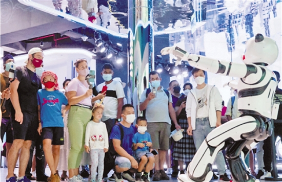 在迪拜世博会中国馆,熊猫机器人优悠同游客进行互动。 优必选科技供图