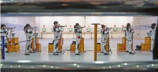 队员们在新建的射击综合决赛馆里一字排开,打靶训练。