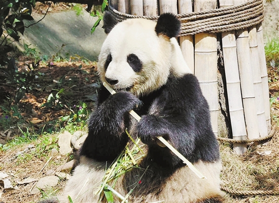 安吉竹博园唯一的雌性大熊猫“珍巧”正在啃食当地产的红竹竹竿。 (本版图片均由受访者提供)
