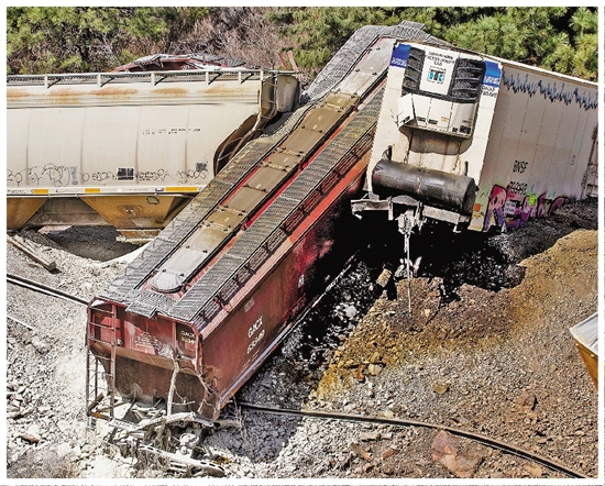 4月2日,一辆货运列车在美国蒙大拿州脱轨,目前暂无人员伤亡报告。图为在美国蒙大拿州的克拉克福克河河畔拍摄的脱轨列车车厢。 新华社发