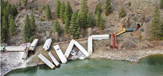 4月2日,一辆货运列车在美国蒙大拿州脱轨,目前暂无人员伤亡报告。图为在美国蒙大拿州的克拉克福克河河畔拍摄的脱轨列车车厢。 新华社发