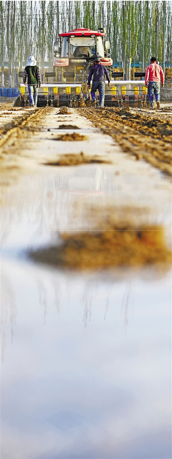 | 进入3月底4月初,天气渐暖,土壤墒情好,新疆棉花春播自南向北拉开序幕。在新疆麦盖提县、尉犁县等地,当地棉农借助卫星导航、农机等,机械化实施作业,全面开展棉花播种工作。图为在新疆麦盖提县,搭载北斗导航自动驾驶系统的精量播种机在棉田春播(4月2日摄)。 新华社记者 丁磊 摄 |
