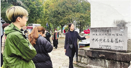 刘佳和(右)在浙东抗日根据地旧址为游客做讲解。 拍友 马晟璐 劳超杰 摄