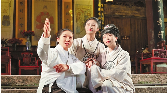 村民马玲(左)教记者(右)演出要领。 本报记者 祝旖波 江山市委报道组 蒋君 摄