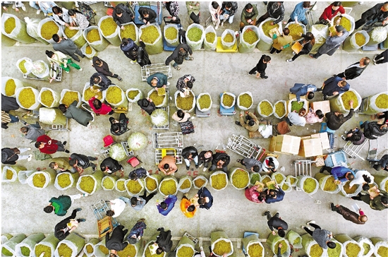 清明过后,浙南茶叶市场交易火爆。今年1月至3月,浙南茶叶市场实现茶叶交易4582吨,交易额达19.2亿元。图为4月10日,各地茶商在丽水市松阳县浙南茶叶市场选购茶叶。 拍友 陈碧鑫 周敏岚 摄