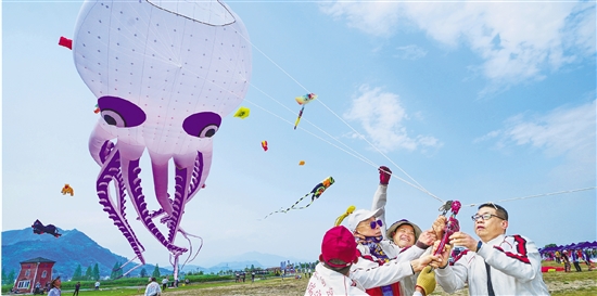 4月11日,2023全国风筝精英赛(瑞安站)在国家级农业公园瑞安曹村田园综合体举行。来自全国各地的25支代表队、117名选手同台竞技。图为选手在放飞“大章鱼”风筝。