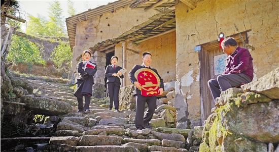 法官们手捧卷宗,怀抱国徽,行走在农家小路上。