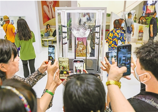 4月14日,第三届中国国际消费品博览会迎来社会公众开放日。图为观众在现场拍摄钻石展品。 新华社记者 张丽芸 摄