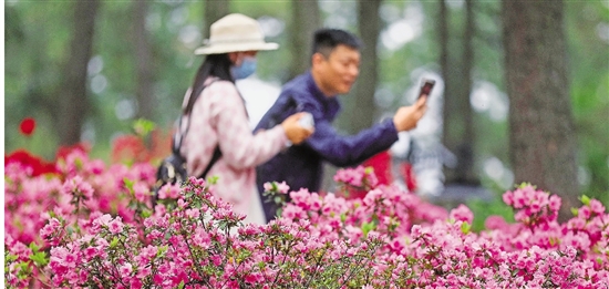 这些天,杭州临平公园杜鹃花盛开。4月15日,不少市民游客专程前来赏花。 本报记者 林云龙 摄