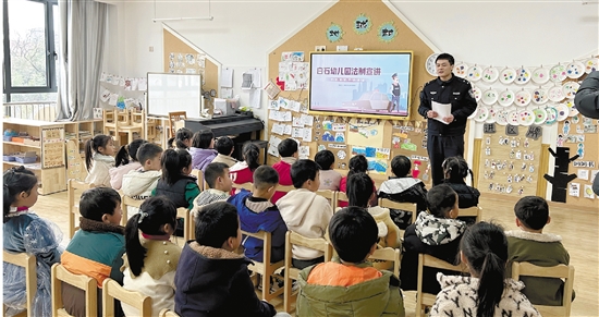 | 与法“童”行,护航未来。近日,常山县公安局新都派出所深化警务融治,走进白石幼儿园开展法制宣传教育活动,积极守护未成年人健康成长。活动中,民警以播放PPT、游戏互动的方式为小朋友们讲解了防范电信网络诈骗、禁毒、交通安全等知识。 黄红飞 摄 |