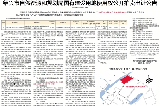 经绍兴市人民政府批准,绍兴市自然资源和规划局决定委托绍兴市柯桥区公共资源交易中心于2023年5月16日上午9时30分,以网上拍卖方式公开出让柯桥区福全FQ-021-09地块国有建设用地使用权。现将有关事项公告如下: