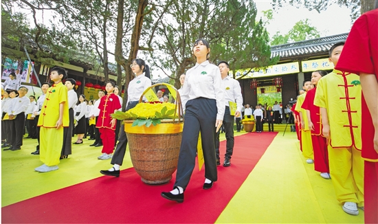 2022年9月,衢州南孔祭典,参祭人员向孔子像敬献花篮。 本报记者 钱洁瑗 摄(资料照片)