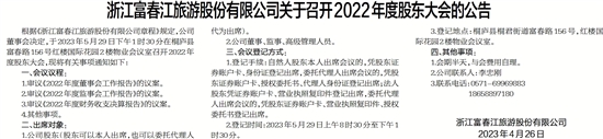 根据《浙江富春江旅游股份有限公司章程》规定,公司董事会决定,于2023年5月29日下午1时30分在桐庐县富春路156号红楼国际花园2楼物业会议室召开2022年度股东大会,现将有关事项通知如下: