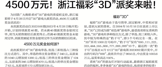 为回馈广大购彩者对“3D”游戏的喜爱和支持,浙江福彩将于4月28日开启“3D”游戏大派奖活动,4500万元派奖奖金送送送!