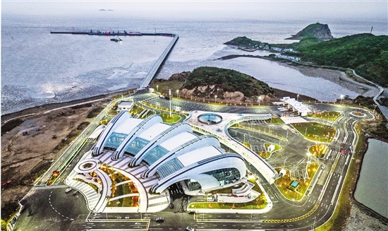 4月25日傍晚,形如大贝壳的岱山县燕窝山客运中心大楼亮灯。燕窝山客运中心总建筑面积约3.3万平方米,将于4月26日投用。