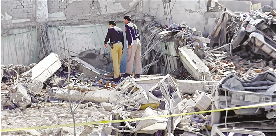4月25日,在巴基斯坦斯瓦特地区,警察检查爆炸袭击现场。 新华社发