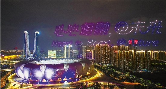 4月25日,杭州亚运会代表团团长大会开幕。当晚,杭州奥体中心体育场上空,数百架无人机变换队形,组成各种亚运元素,营造喜迎杭州亚运会的浓厚氛围。 本报记者 董旭明 摄