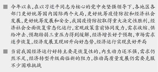 ■ 今年以来,在以习近平同志为核心的党中央坚强领导下,各地区各部门更好统筹国内国际两个大局,更好统筹疫情防控和经济社会发展,更好统筹发展和安全,我国疫情防控取得重大决定性胜利,经济社会全面恢复常态化运行,宏观政策靠前协同发力,需求收缩、供给冲击、预期转弱三重压力得到缓解,经济增长好于预期,市场需求逐步恢复,经济发展呈现回升向好态势,经济运行实现良好开局