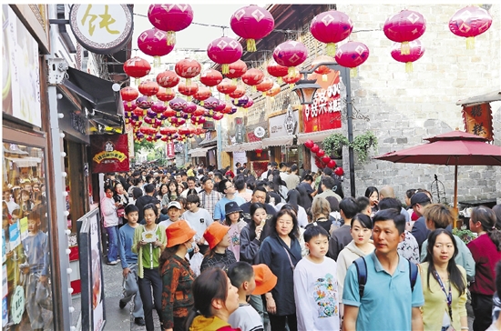 “五一”假期,宁波市海曙区南塘老街游人如织,烟火气回归,消费大幅升温。 本报记者 魏志阳 摄