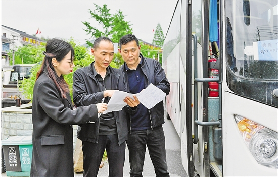 记者(左)帮王爱强(中)和大巴司机(右)核对游客人数。 共享联盟·长兴 谭云俸 张泽民 摄