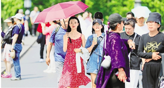 5月4日,杭城最高气温达33℃,恍若入夏,西湖景区游客“全副武装”出游。
