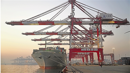 一艘货轮靠泊在天津港联盟国际集装箱码头进行装卸作业。 新华社记者 赵子硕 摄