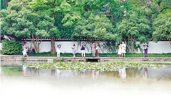 5月14日,游客在杭州西湖郭庄景区观赏睡莲。 本报记者 朱海伟 摄