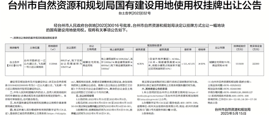 经台州市人民政府台供地[2023]30016号批准,台州市自然资源和规划局决定以挂牌方式出让一幅地块的国有建设用地使用权。现将有关事项公告如下: