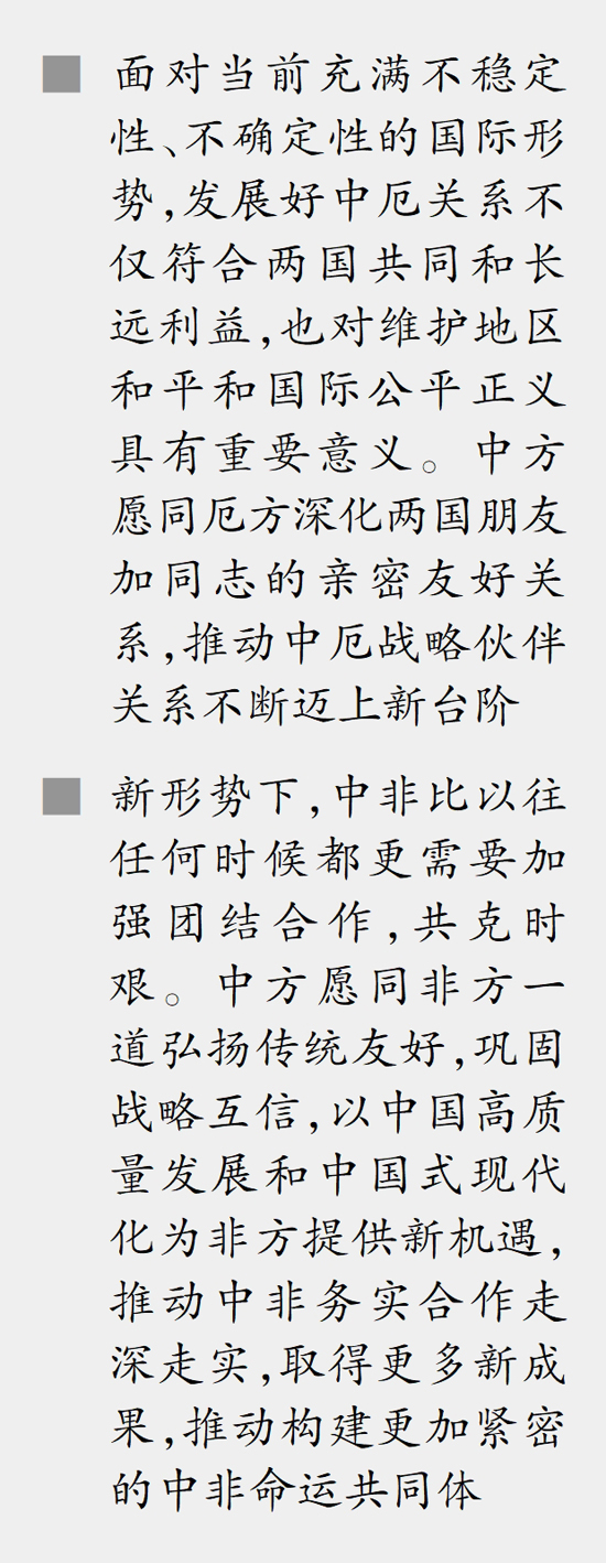 ■ 新形势下,中非比以往任何时候都更需要加强团结合作,共克时艰。中方愿同非方一道弘扬传统友好,巩固战略互信,以中国高质量发展和中国式现代化为非方提供新机遇,推动中非务实合作走深走实,取得更多新成果,推动构建更加紧密的中非命运共同体