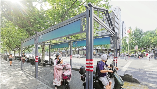 5月15日,在杭州凤起路与新华路路口非机动车道上,遮阳棚框架已经安装完毕。据了解,杭城各路口非机动车道上的遮阳棚将于5月底前陆续“上岗”,为广大市民提供遮阳避雨服务。 本报记者 林云龙 摄