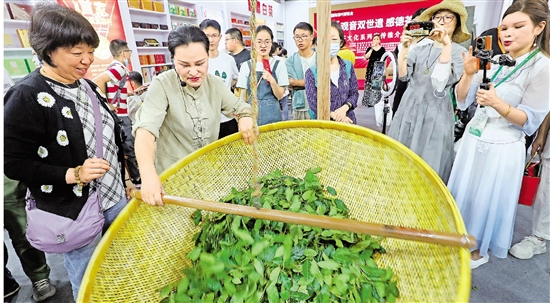 | 5月20日,第五届中国国际茶叶博览会在杭州国际博览中心开幕,全国22个省份组团参加,近900家国内外知名茶企参展。为期5天的茶博会以“茶和世界 共享发展”为主题,展示展销面积达5万平方米,促进茶产品贸易、传承弘扬茶文化。图为制茶工艺展示。 本报记者 林云龙 摄 |